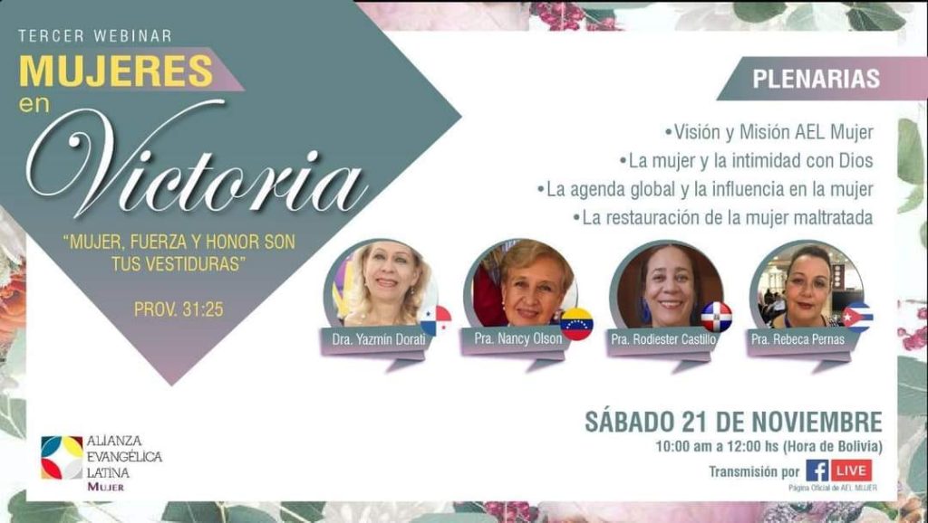 LA COMISIÓN AEL MUJER INVITA AL TERCER WEBINAR “MUJERES EN VICTORIA”Le motivamos a participar de este Webinar planificado para cada mujer de América Latina que desea confirmar el hermoso llamado que Dios le hace de “levantarse”, en su familia, hogar, iglesia y sociedad en general.