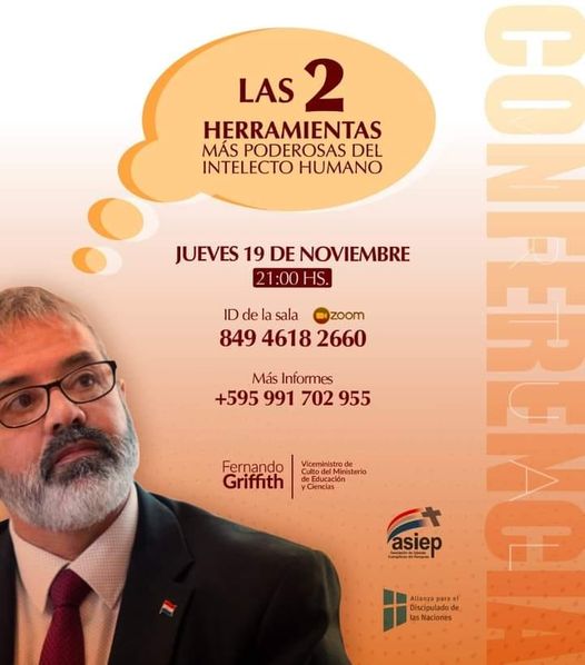 El eje de Cosmovisión Biblica de la ASIEP y ADN joven Paraguay te invitan a esta charla imperdible, el jueves 19 de noviembre a las 21:00hs. Con el actual Viceministro de Culto, quién en esta ocasión nos compartirá sobre: Las 2 herramientas más poderosas del intelecto humano.